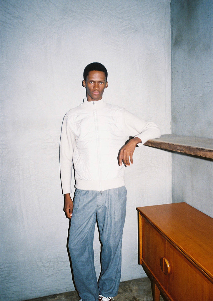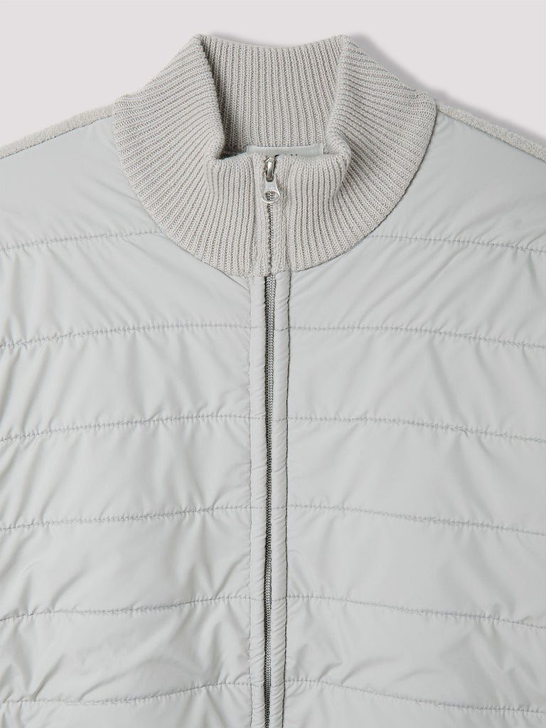 前身頃は、防風性と軽快さを併せ持つポリエステル素材のパネルを使用。マットな質感と横方向の切り替えが特徴で、アクティブな印象とシャープさを与えすっきりとしたシルエットを保ちます。