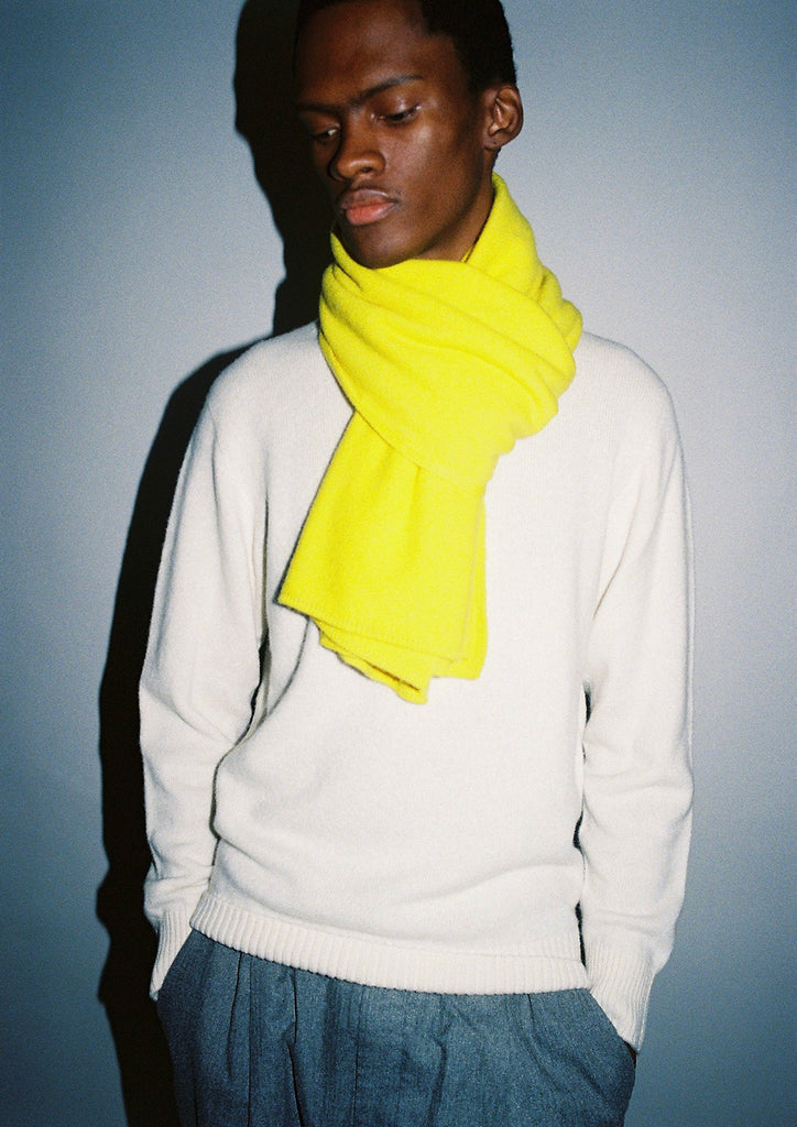 外モンゴル地域で採れるモンゴルカシミヤを使用。10Gの機械で編み立て、表面にファー加工を施しふっくらした柔らかな風合いに。カシミヤセーター1着分くらいの量を使用した贅沢な大判Scarfになります。