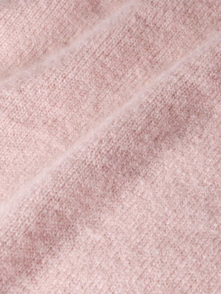 希少なモンゴリアンカシミヤを使用し、7ゲージの編み機でやや度甘(どあま)に編み立て、まるでマシュマロのような柔らかさを実現しました。さらに、ファー加工を施すことで、カシミヤ本来の滑らかでふっくらとした風合いを最大限に引き出しています。